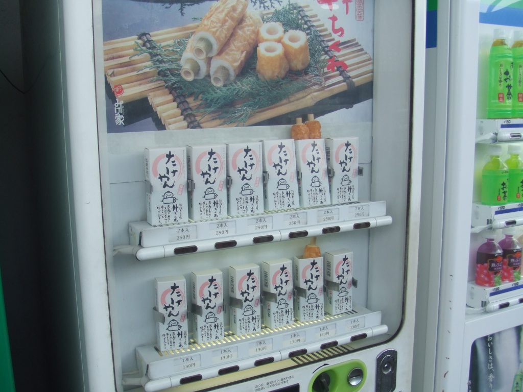 「たけやん」とは竹ちくわで、ジュースの紙パックのようなパッケージに入っている。紙パックだけ並べているとジ ュースと間違えられると思ってか、2パックほどは「ちくわですよ~」と少しパックからちくわをのぞかせている。また、ご丁寧に上段は2本入り(250円)、下段は1本入り(130円)と利用者のニーズに合わせてチョイスできるようになっている。