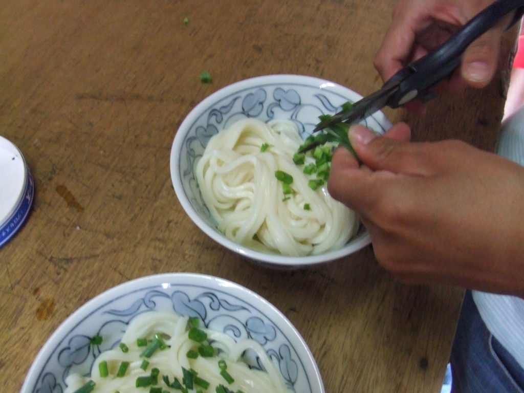 「だし」で食べるか「醤油」で食べるかを聞かれて、今回は醤油にした。麺だけが入った器を渡され「そこにあるネギをはさみで切ってな~」。あとは、「そのチーズの箱にお金入れといて~、サンキューベリマッチ」。一杯150円なり。