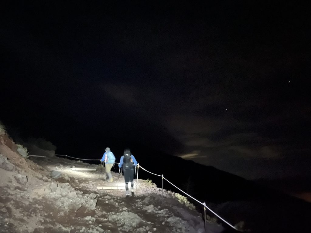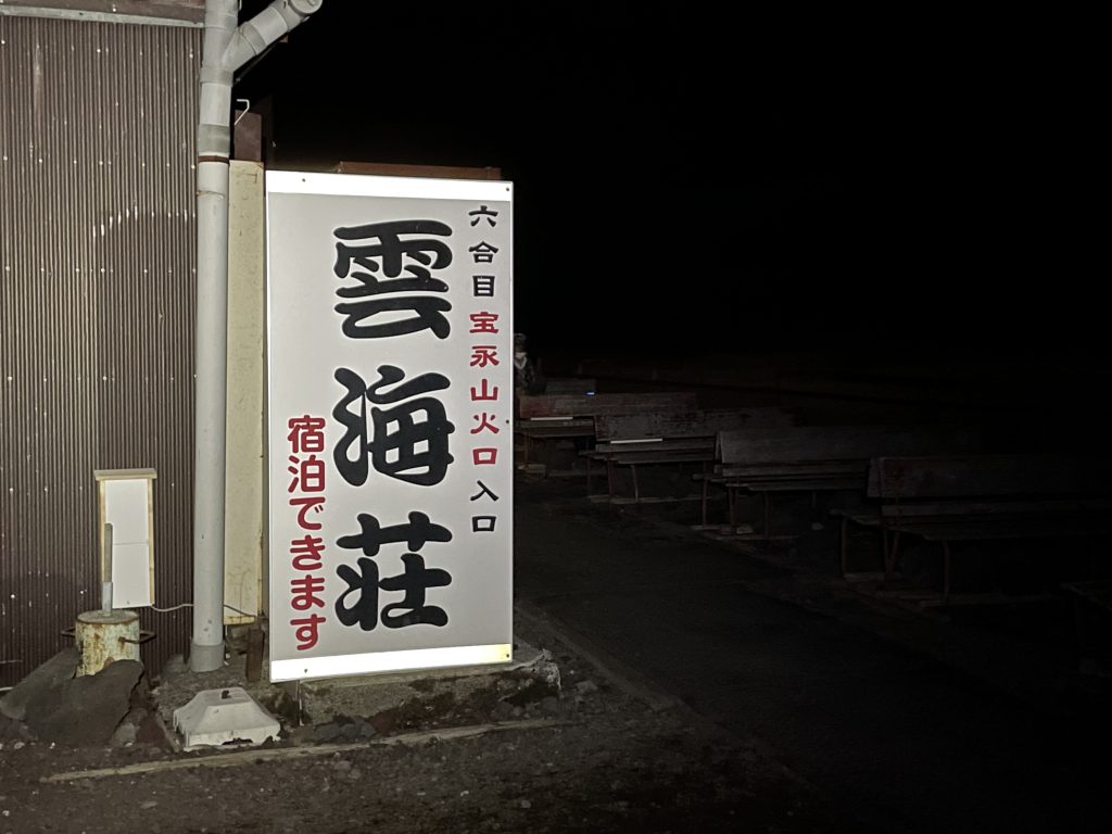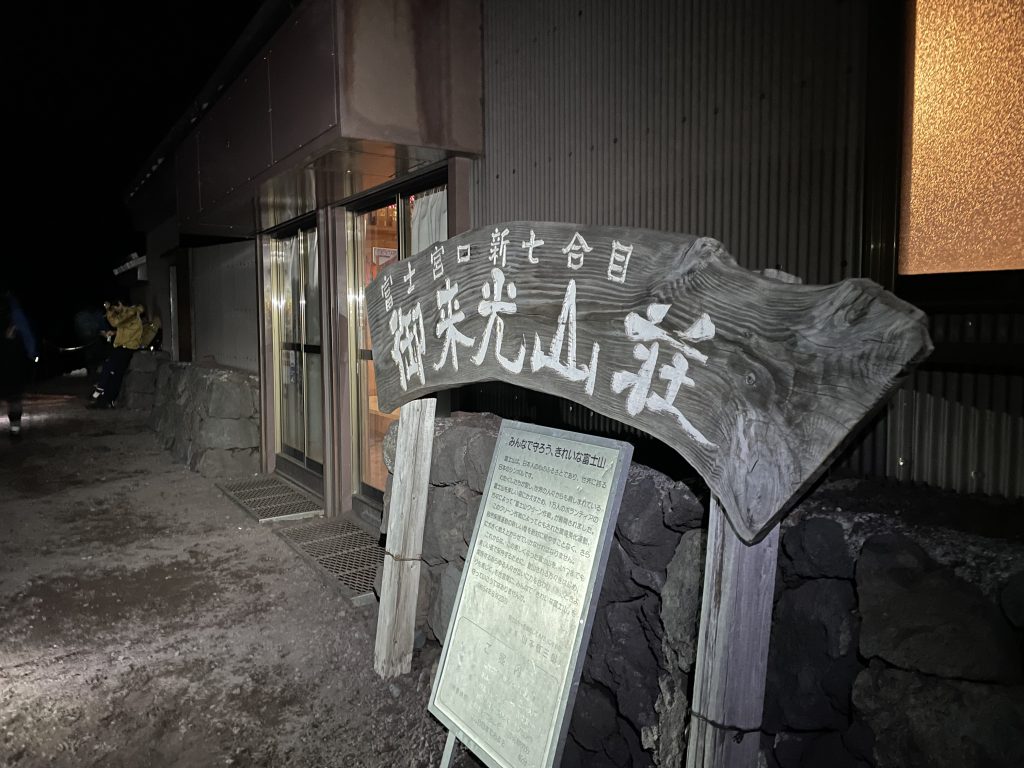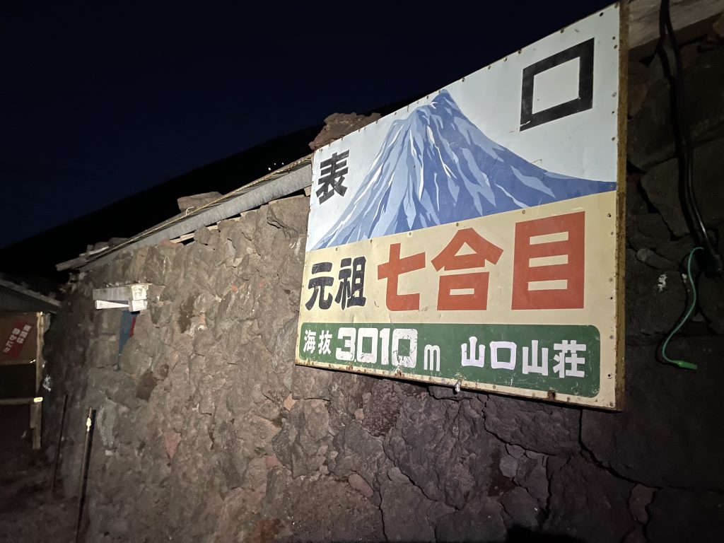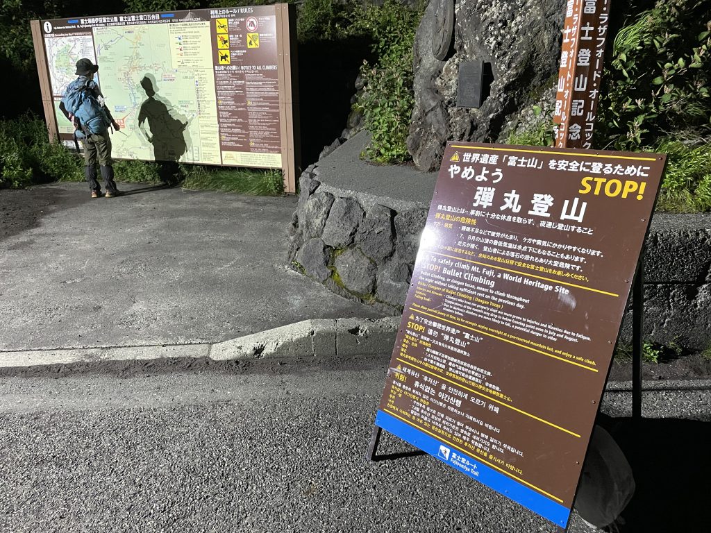 「やめよう弾丸登山」の看板を横目に、午前2:30登山開始。登山口入ってすぐのトイレだけ立ち寄り、真っ暗な中登り始める。富士山登山ルートのうち、五合目スタートで距離の短い富士宮ルートだ。
