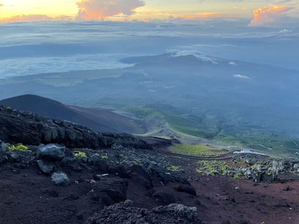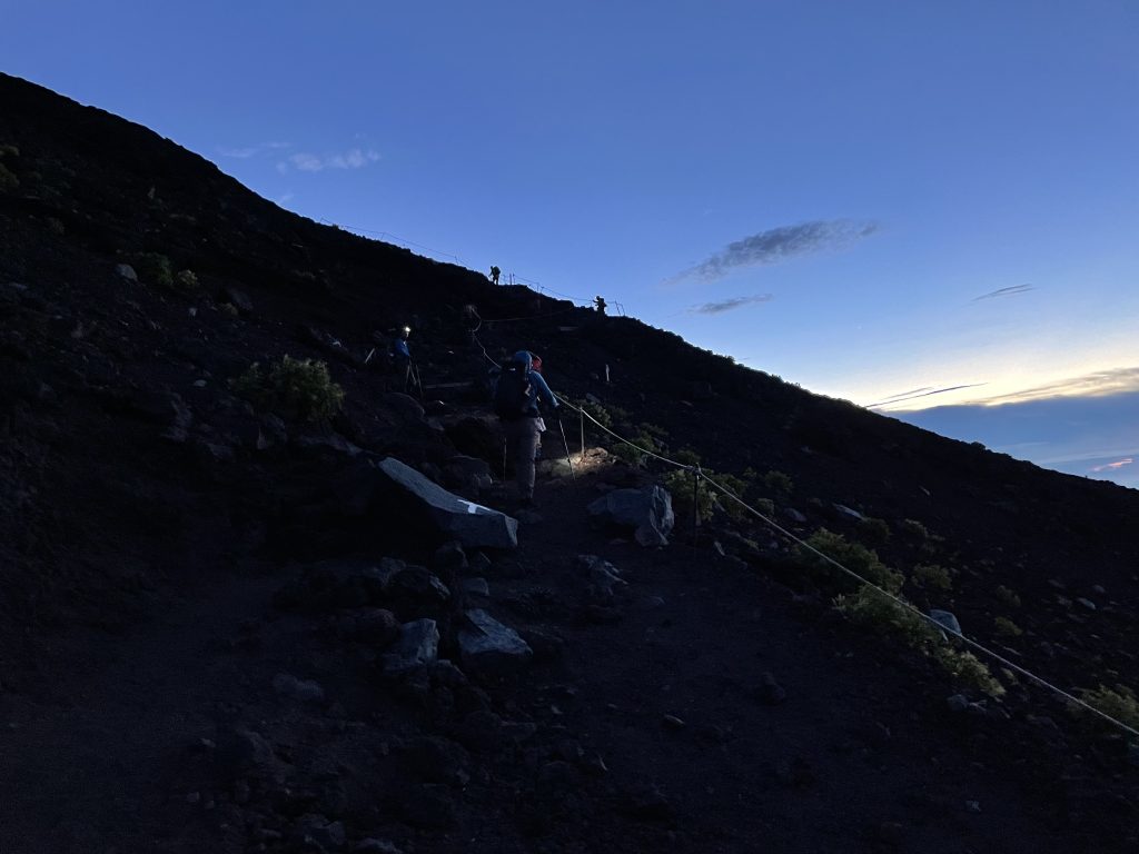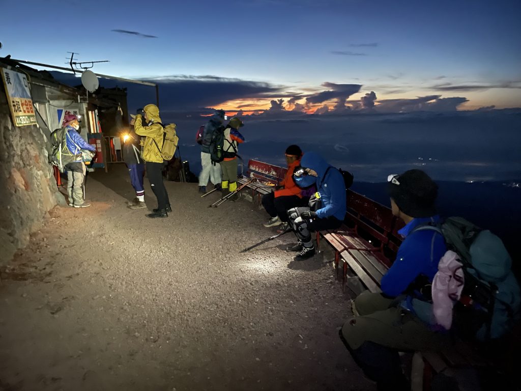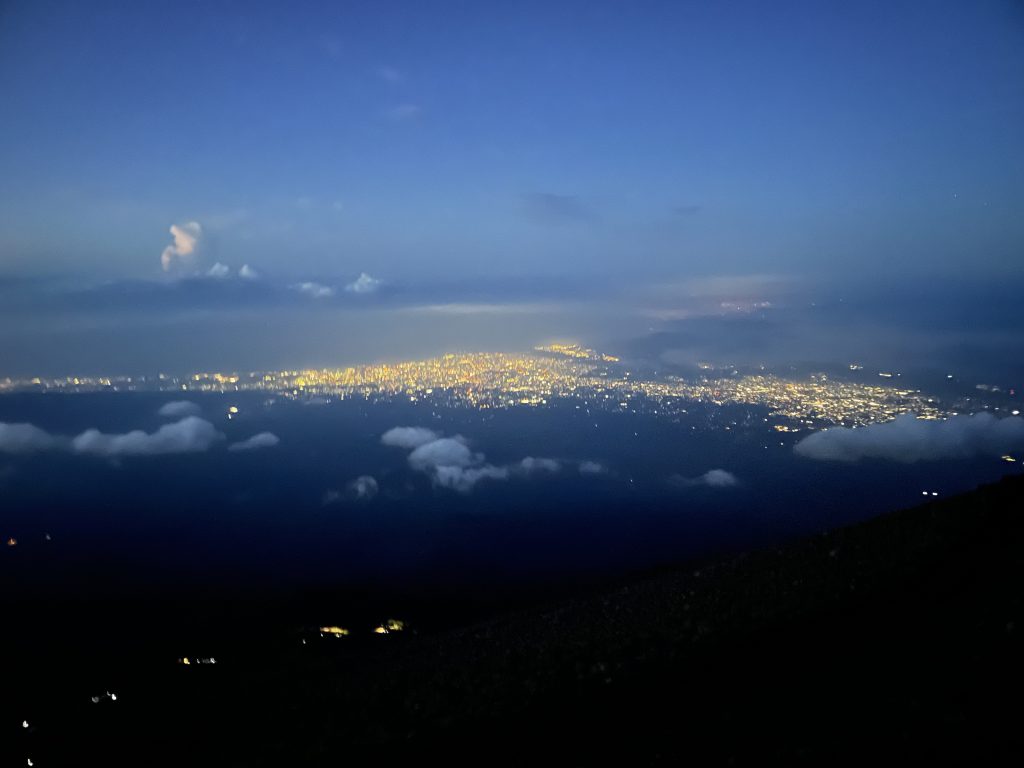 この元祖七合目で標高3000mを超えるわけですな。まだ日の出までには時間があるんだけど、日が昇る方の空がオレンジに。平野部を見下ろすと、まだまだ夜景な感じだけどね。