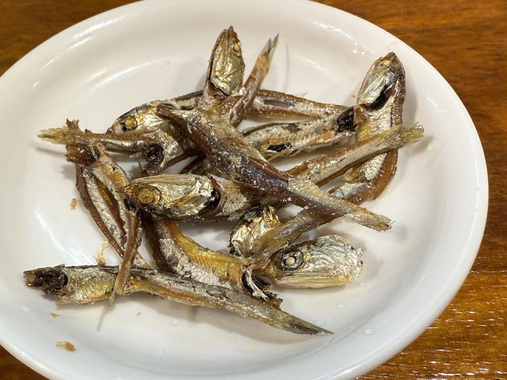 カリカリ煮干必要な方はお申し付け下さいか…ちょっともらおうかな。小皿に入って出て来ましたよ。素揚げの煮干しなんだけど、軽くて噛むと細かく粉になるかのよう。噛むほどに旨みが広がる。