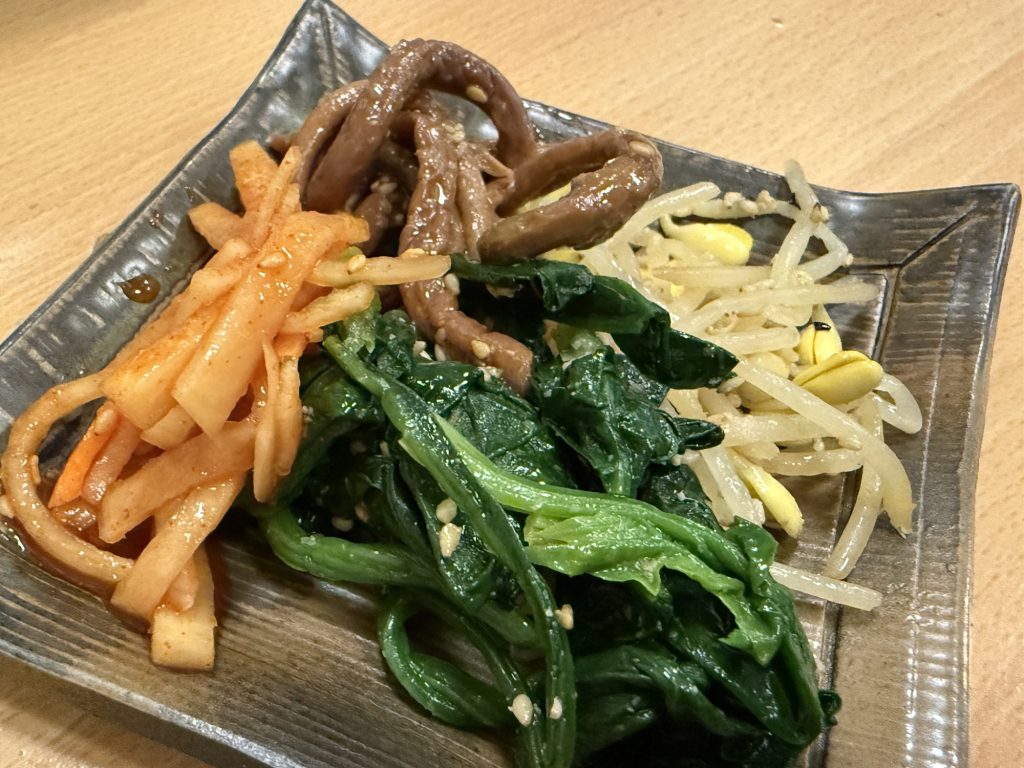 ビール(550円税込)とホルモン鍋は…ミックスホルモン鍋(1680円税込2人前〜)がいいね。鍋が出来るまで、ちょっとナムルも出していただいて。