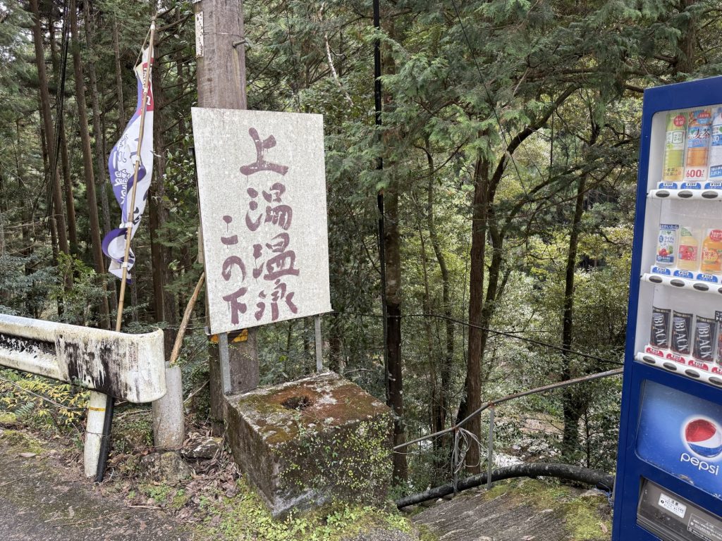 唐突に公衆トイレと駐車場が現れるので、慌てて車を止めてみる。駐車場に「ここは上湯温泉」とあるな…