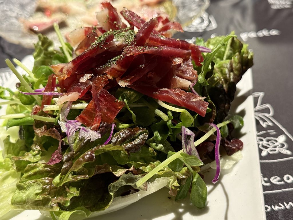 スペイン産切りたて生ハムサラダ(M 900円税込)。