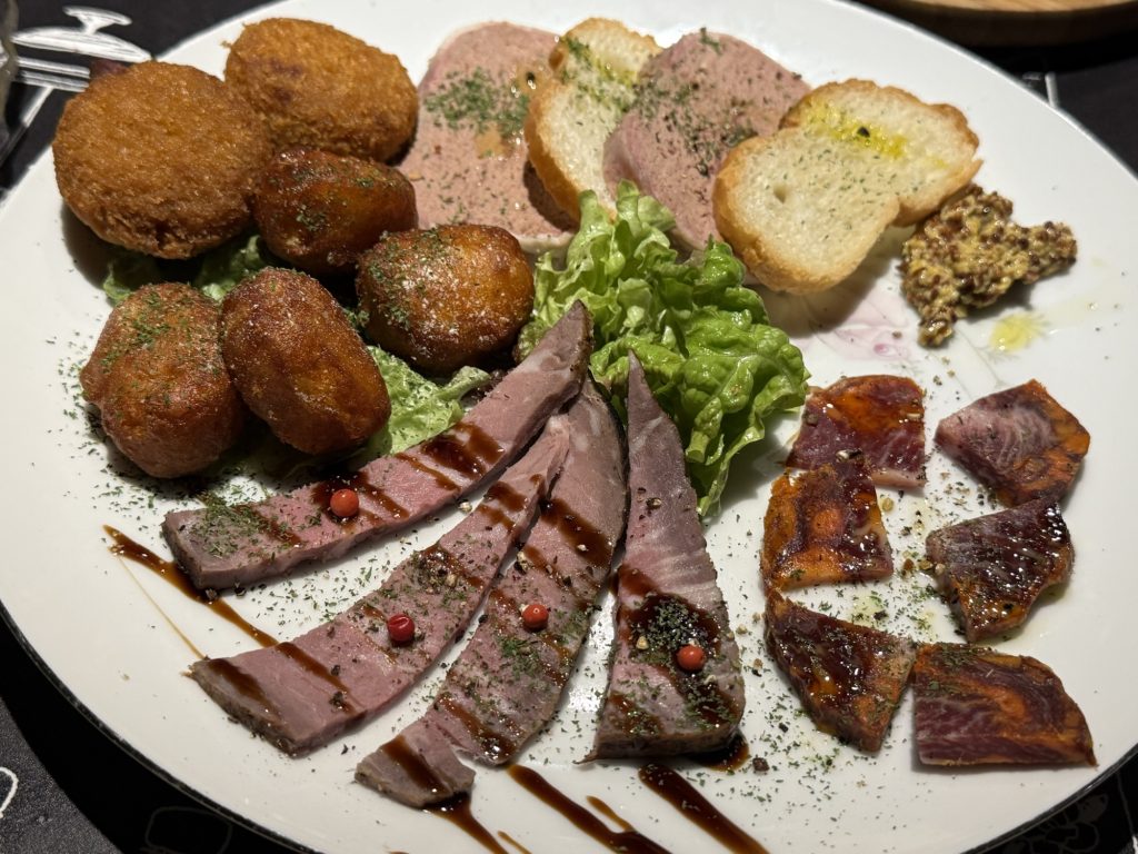 ライスコロッケトマトバジルリゾットは甘めのケチャップが美味しい。自家製ローストビーフはしっとり、そして、肉肉感がいいですな。お、イベリコ豚のチョリソーサラミも濃縮した旨味がたまらんわね。