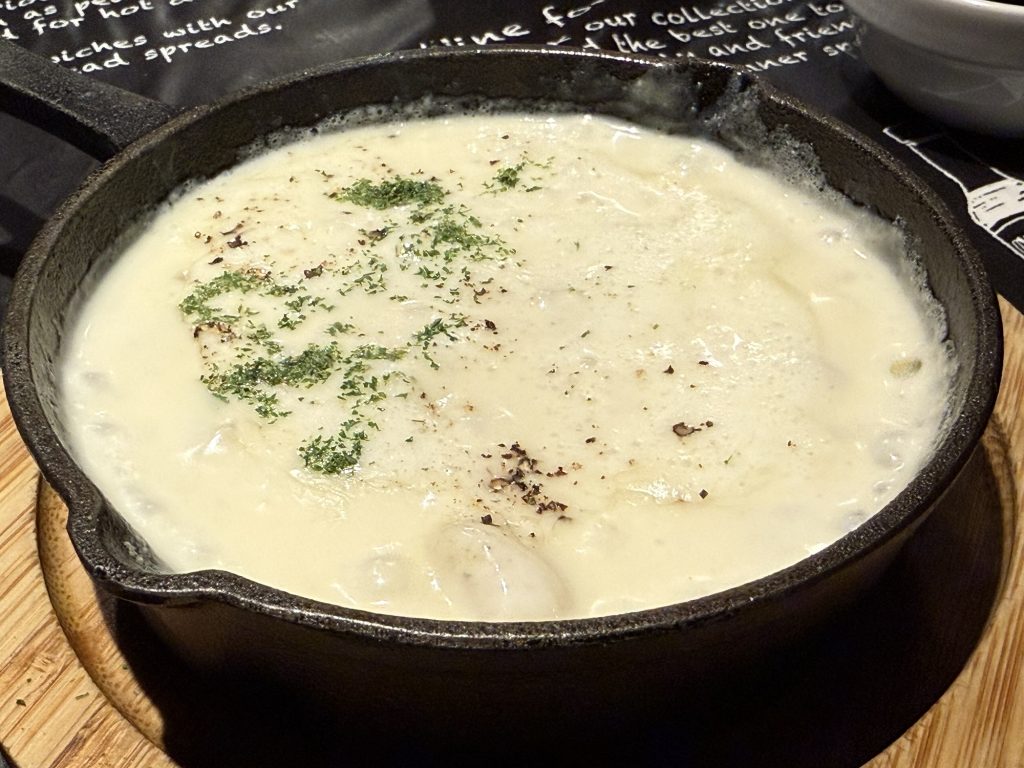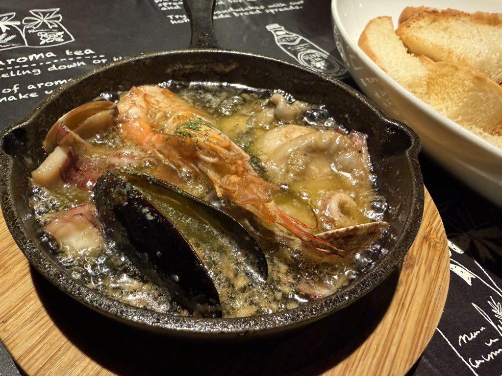 アヒージョからは、海鮮いろいろスペシャル(1050円税込)を。牡蠣も入って酒進むアイテム。