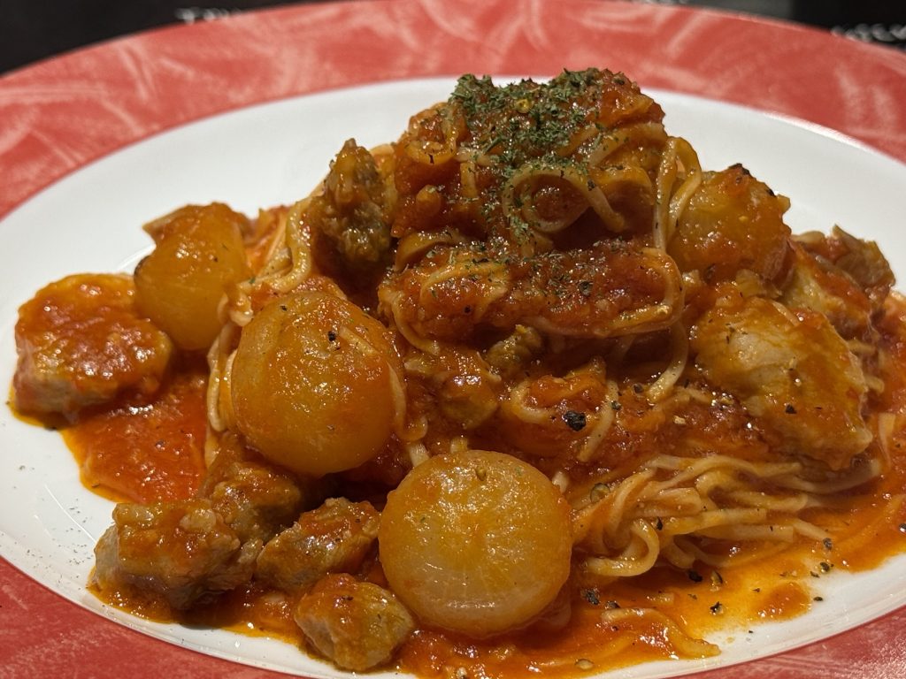 コロコロ玉ねぎのアマトリチャーナ(1450円税込)。自家製の生パスタが細いんだけど、もちっと感と程よい歯応えにはまる。トマトの酸味を感じつつも旨みしっかりで満足度が高い一皿。