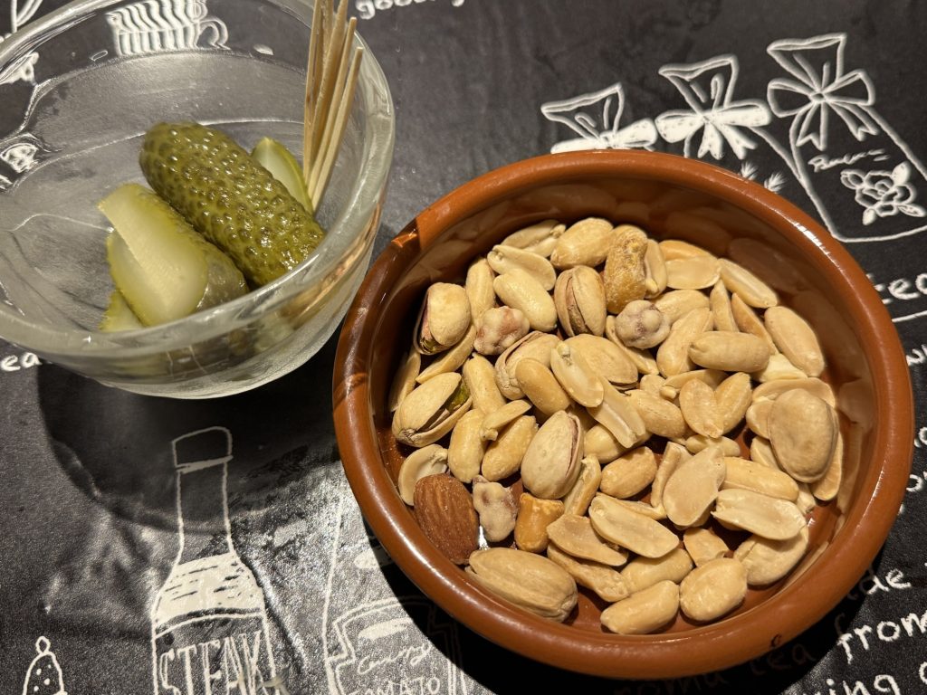 ピクルス(300円税込)やミックスナッツ(350円税込)をつまみながらピーチクパーチク。