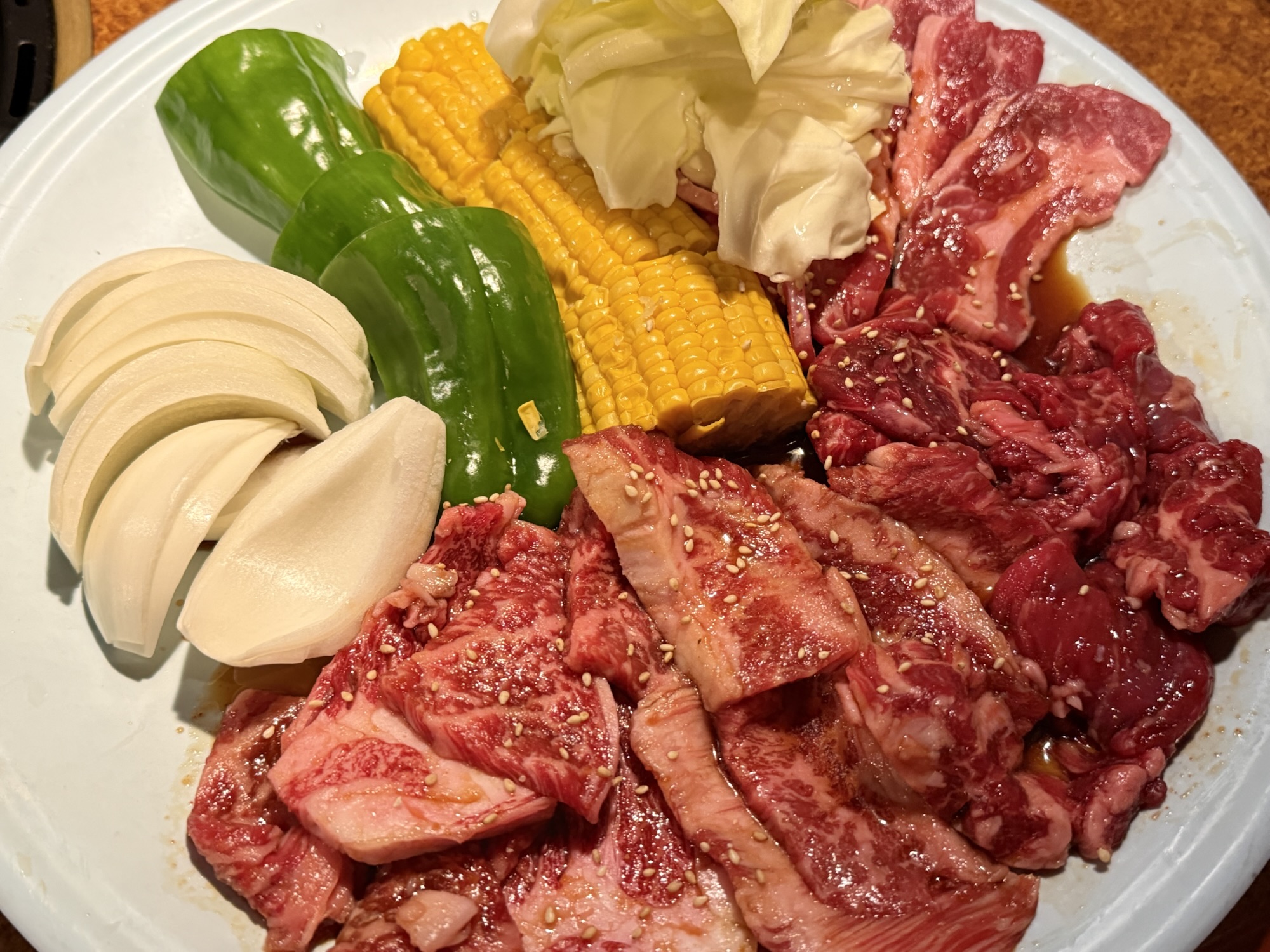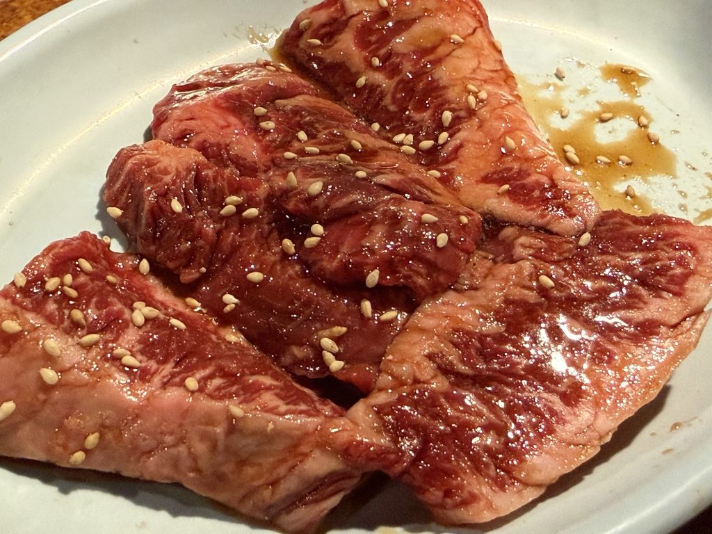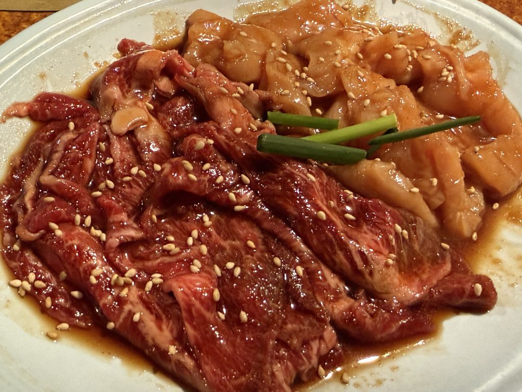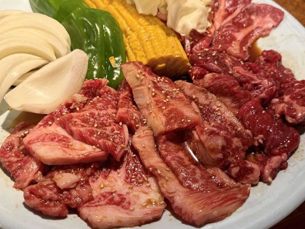 セットメニューから焼肉盛り合わせ(3680円税別)を。2〜3人前用で、ロース、カルビ、カイノミ、牛バラと焼き野菜というラインナップ。嬉しい組み合わせなところに、いいボリューム感ですよ。