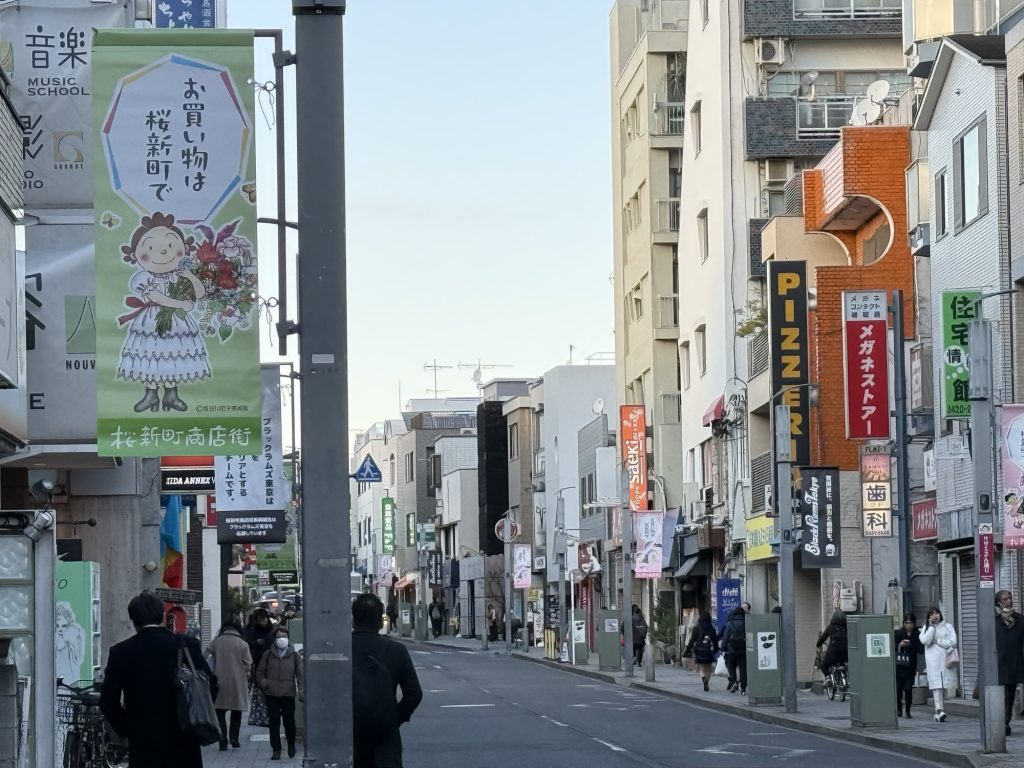 そこから少し西へ進むと、サザエさん通りへと入る交差点。この一角は、桜新町商店街振興組合のお店が軒を連ねているが、祖師ヶ谷大蔵周辺の商店街と趣が異なり、広めの道路の両サイドにお店がある。