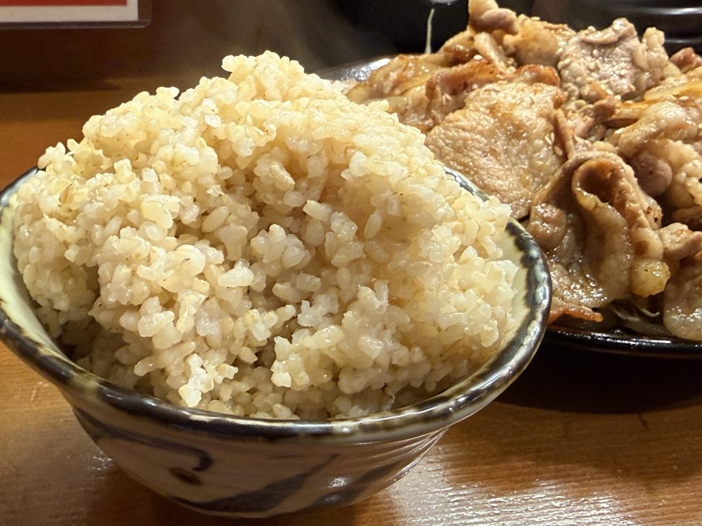 飯は白米か玄米が選べる。玄米にして…お肉の量が結構あるので、後半ご飯無くなるのも辛いから大盛り(100円税込)にしておくか。玄米は粒が固めなのでサクサクとした歯応え、よく噛んでいただく。
