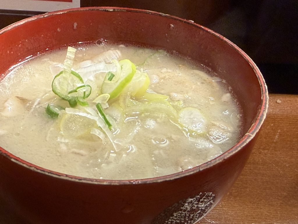 豚汁は麦味噌を使っていて、まろやかで甘い味わい。実に美味いですな。大根、牛蒡、豚肉がごろごろ入っていますよ。