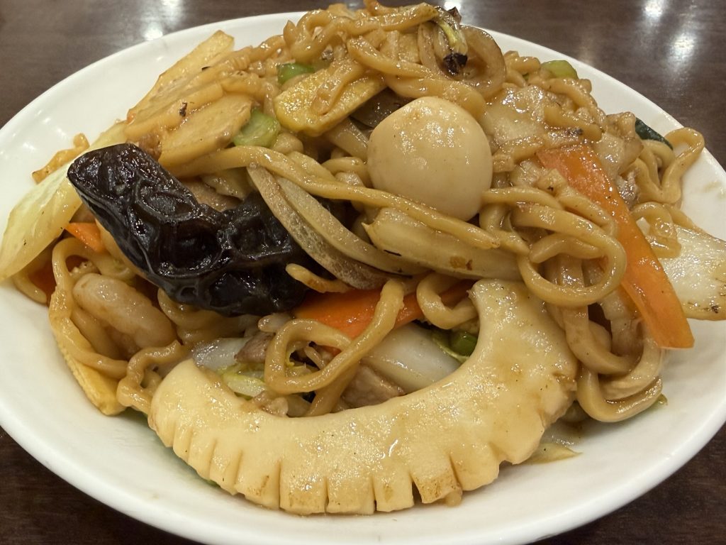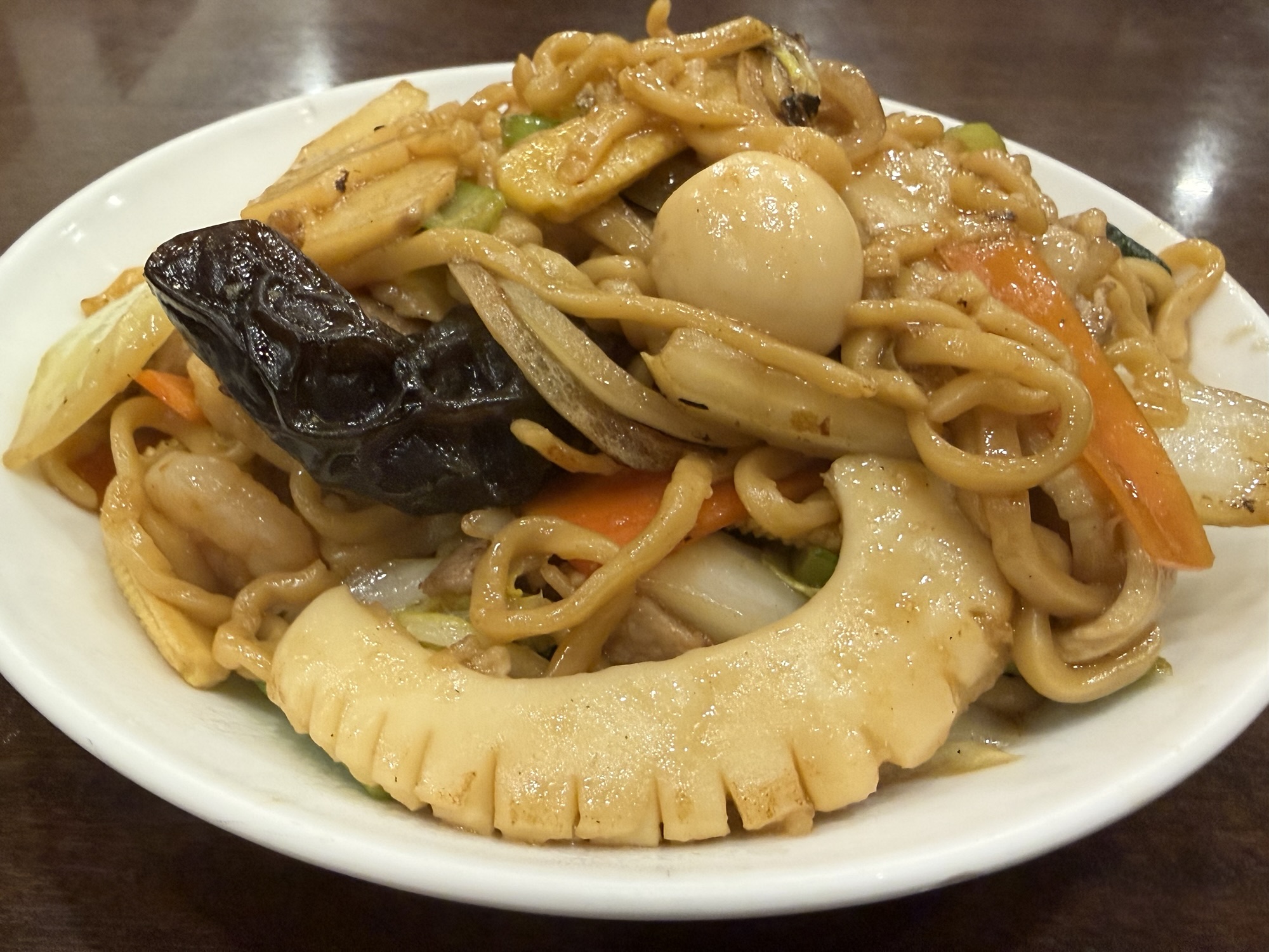 餡掛けスタイルでないんだね。これまた美味いですなぁ。鼻腔を刺激する感じ…これは胡麻油かしら、炒めの香ばしい香りと味わいがたまりませんな。オイスターソースがベースかな。具材もかなり豊富で、豚肉、チャーシュー、いか、えび、うずら、木耳、人参、白菜、玉ねぎ、青梗菜、ヤングコーン、たけのこ…カットも大振りで食べ応えがある。