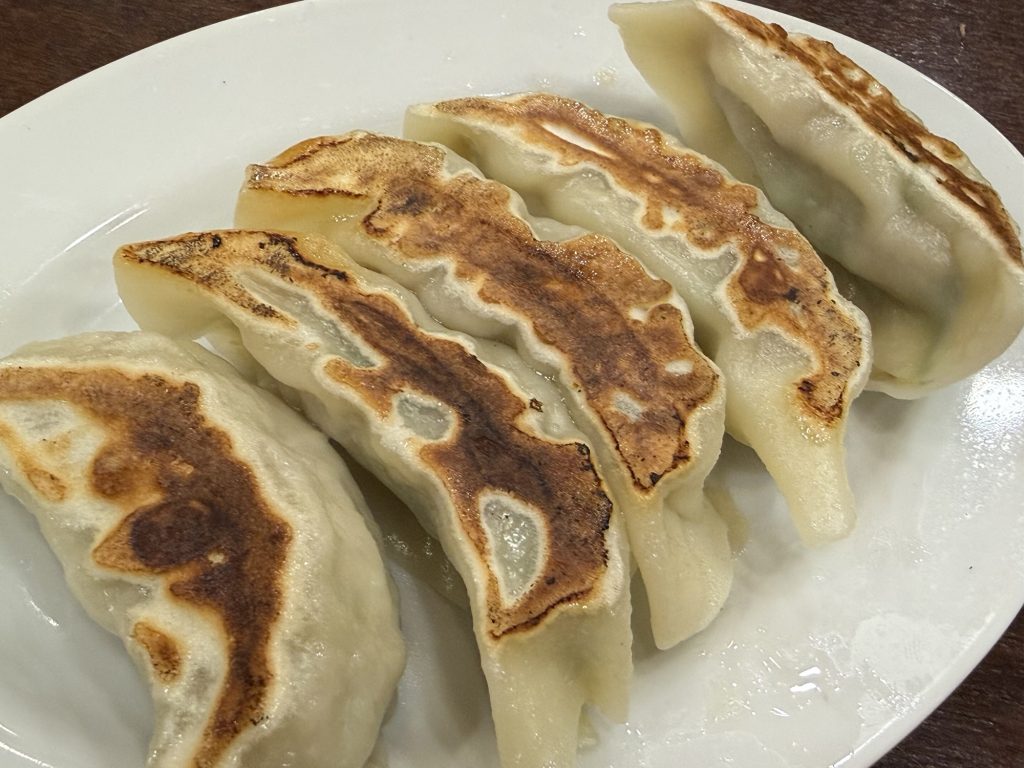 大振りで厚めの皮、焼面がパリッと。何もつけずにそのままかぶりつくとしっとりたっぷりの餡、旨みもありにんにくもきいていながら、思っていたよりもあっさりめ。野菜もシャキシャキだ。
