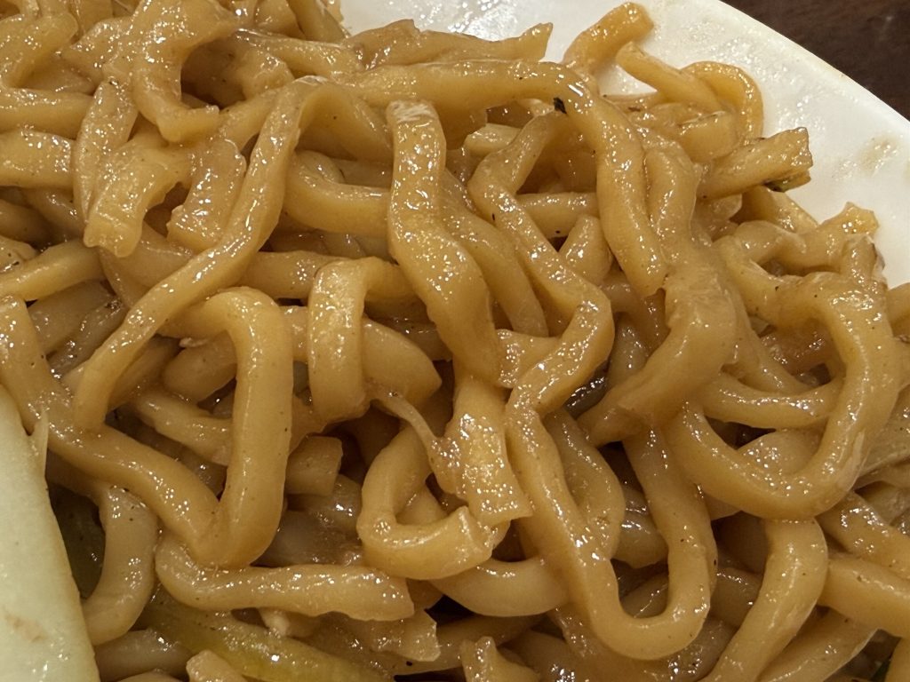 麺は平打ちの縮れ太麺で、ぷりんと弾けるところ、実は柔らかめでぱつんと歯切れがよい。