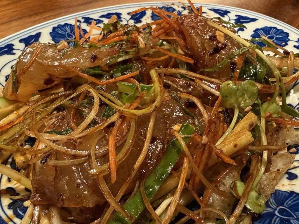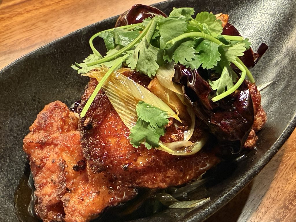 一緒に盛り付けられている朝天唐辛子はカラッと揚げられていて一口で食べても辛くはないんだけど、タレは唐辛子の他にニンニクや花椒なども入って、頭のてっぺんが痒くなる小汗かく辛さ。これ美味いなぁ。
