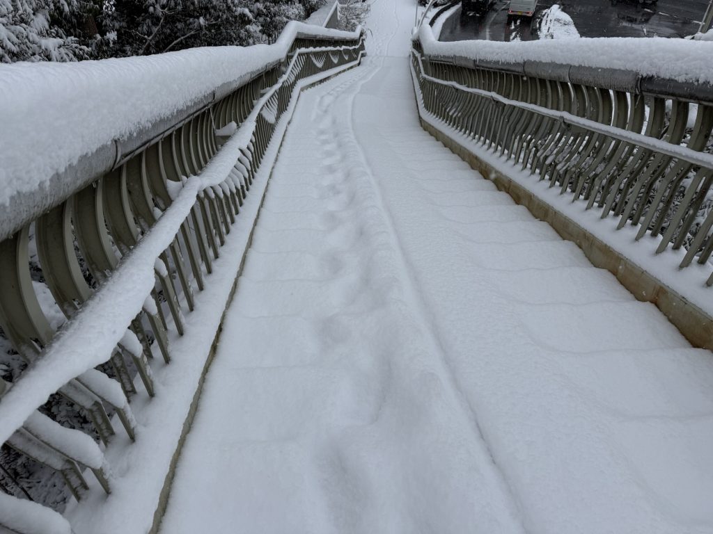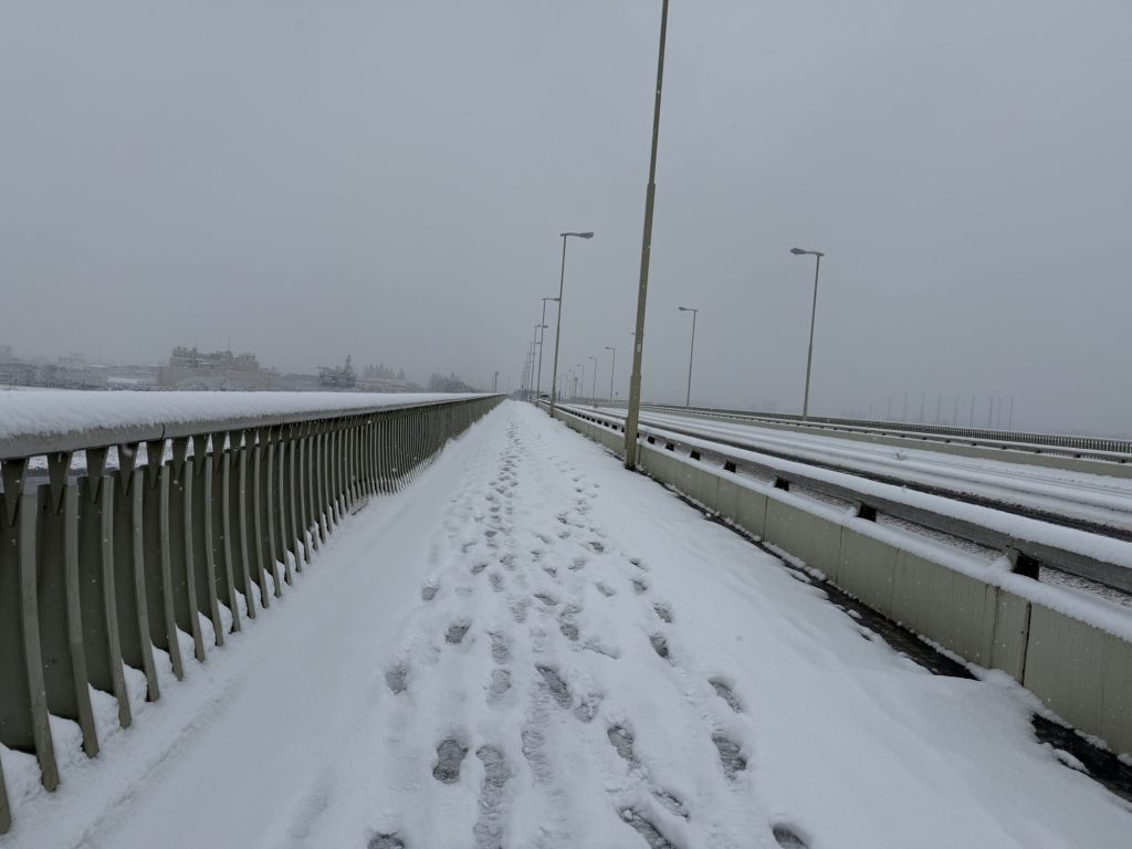 駅から北上し多摩川方面へ。稲城大橋を渡り、そこから高速道路沿いに西へ進む。セルフ雪中行軍だわ。