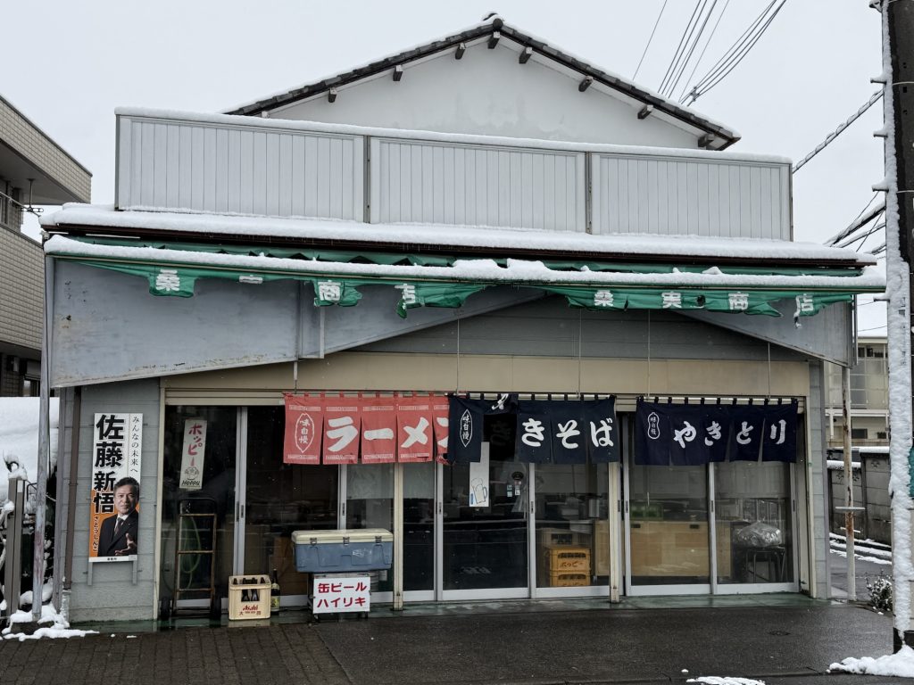 駅を北口に出てそのまま競艇場通りを進むと、あ、ここここ。この構えですよ、桑実商店。
