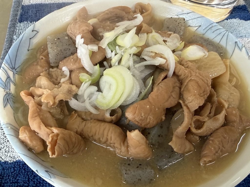 モツ煮込み(550円税込)を発注。粘度はないサラッと仕立て。蒟蒻、大根、白ネギと共に平皿にもつがたっぷり。しつこくないのに醤油ベースでしっかり美味しい。白ネギのシャキシャキと爽やかさがいいアクセントになってるわ。