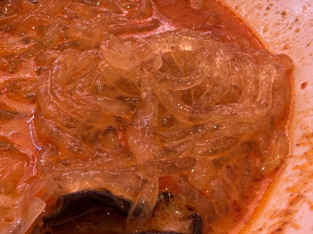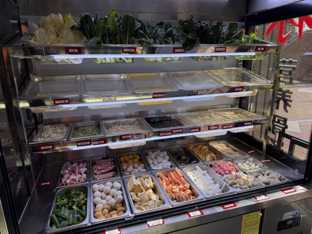 何をどの程度食べるかは人それぞれだが、C級呑兵衛は最初に麺を選んで、その後他の具材を選ぶ。麺は5種あって、春雨は同じトレイに太いのと細いのがある。細い春雨チョイスで、あとは葉物で小松菜・チンゲン菜、きくらげ・白きくらげ、えのき、山くらげ、れんこん、牛肉に蟹団子をチョイス。