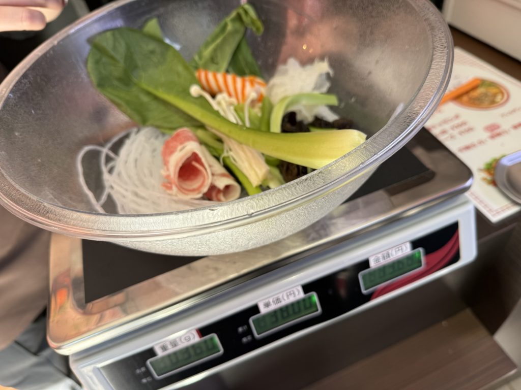 ボールが大きいので色々入れてしまいそうだが、すぐ横にレジと量りがあるので少しずつ量りながら具材を入れていくことが出来るぞ。