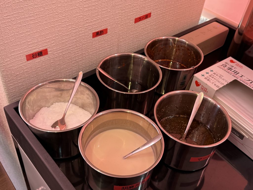 デフォルトで十分美味しいんだけど、味をカスタマイズしたい人には調味料コーナーもあるぞ。