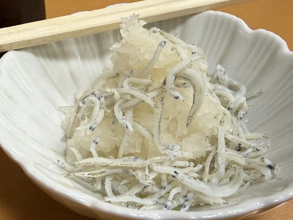壁に貼られたメニューに、「おとし」「別おとし」とあって何だろう?と思っていたのだが、あ…お通しのことか。お通し(70円税込)には、盛りっとしらすおろし。
