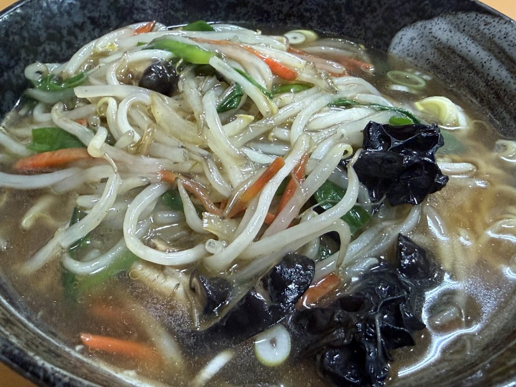 麺の上には、もやし、人参、にら、木耳、厚めに切った椎茸を炒めて餡掛けにしたものが盛り付けられている。