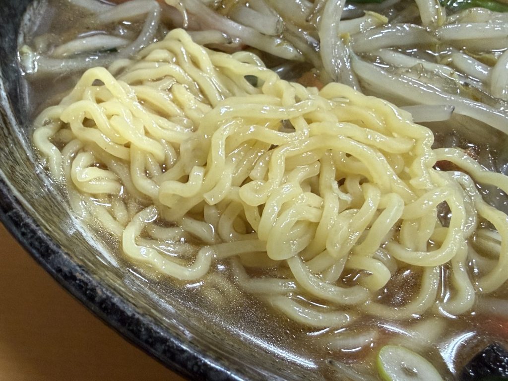 中細の縮れ中華麺、もちっとした歯応えが楽しめる。