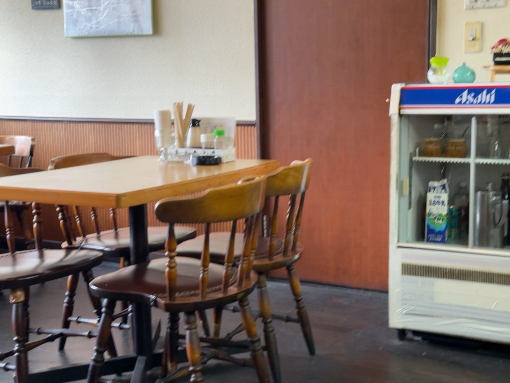 お店は建物の2階で、細い階段を上がる。店内はカウンター5席、2人掛けテーブルが4卓、4人掛けテーブルが2卓。外光が大きな窓から入るが、蛍光灯ではないからか少し薄暗い感じ。