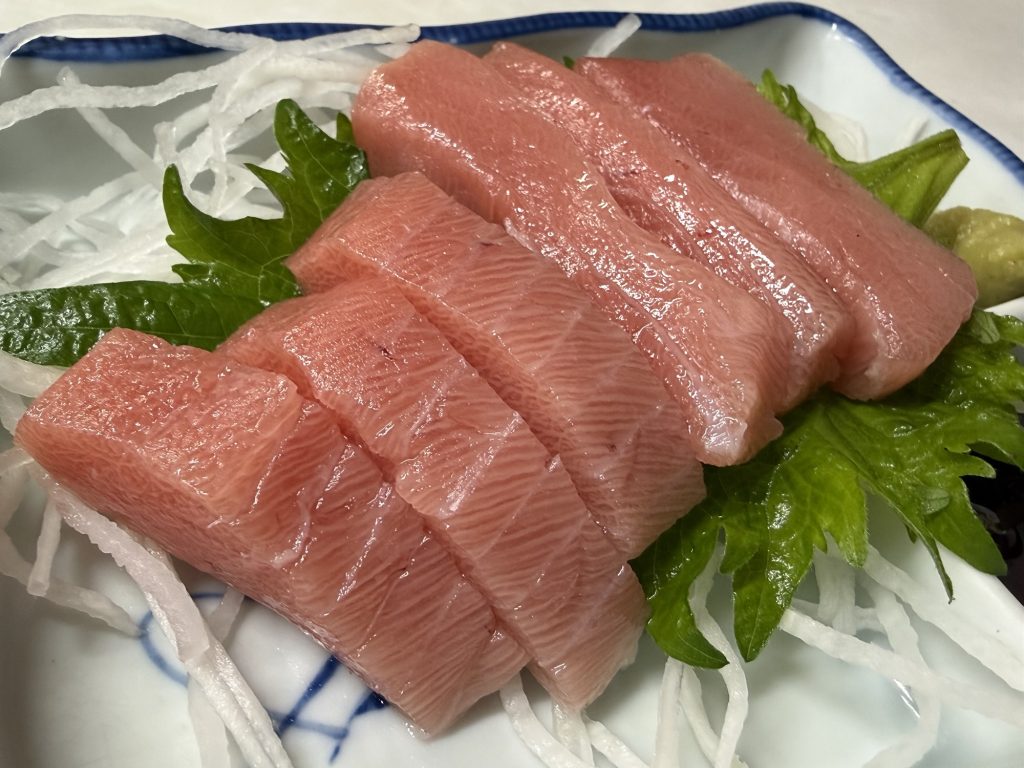 まずは、まぐろ刺身。お、中トロで出してくれるのね。これがしっとり滑らかで旨し。