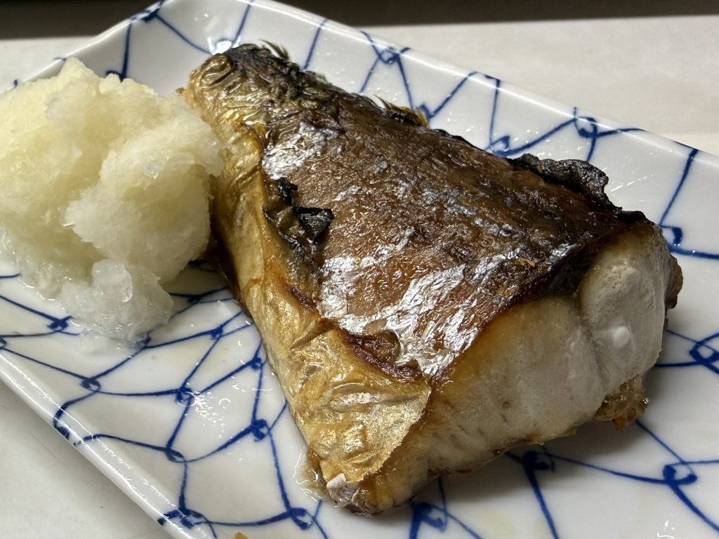 鯖の塩焼き。「おなかとしっぽ、どっちしましょ」一見にも気さくで優しいお母さん。尾の方をもらうんだけど、身の厚い鯖ですなぁ。