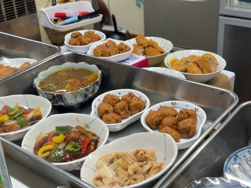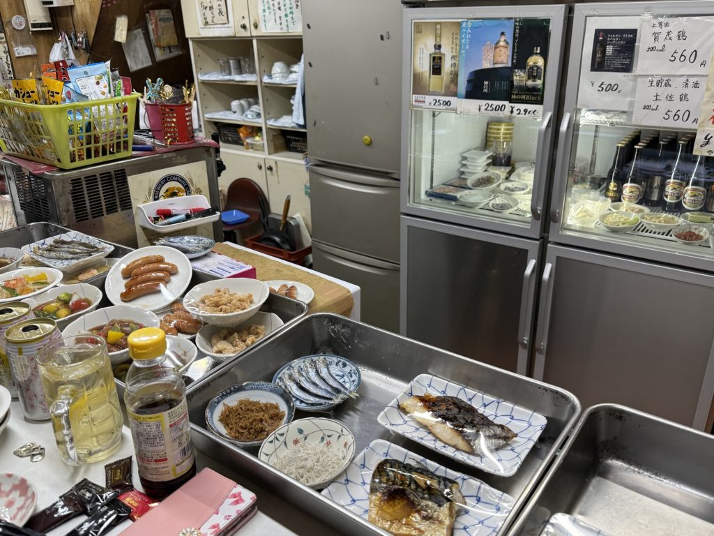 ちょうどお客さんが数名出たところなので、入ってすぐのカウンターに陣取れた。目の前には小皿で色んな惣菜が用意されている。角打ちらしく乾き物もあるね。早くもワクワクする。この時間だからなのか分からないけど、これでお母さんがワンオペなのか。