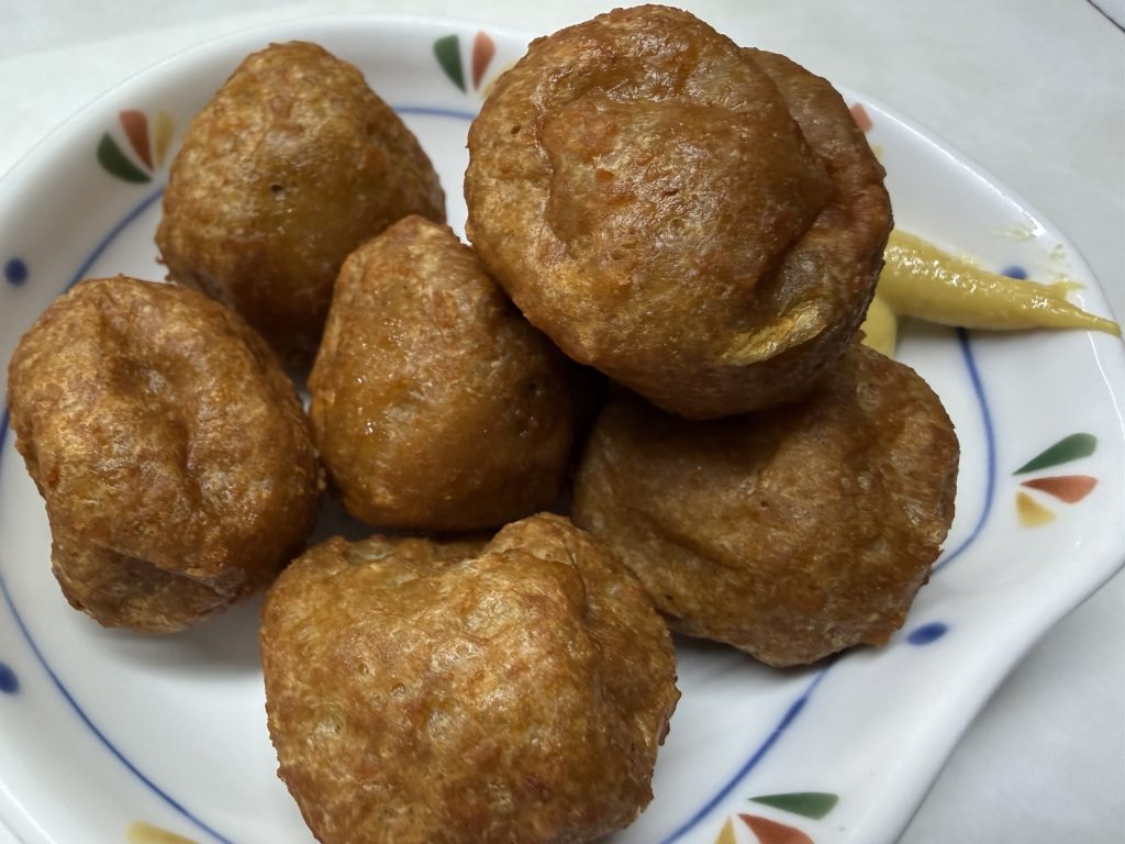 「これは何ですか?」と尋ねて出してもらったのは肉団子。からっと揚がったところにお肉の旨みが口に広がる。ハフハフしていただく。