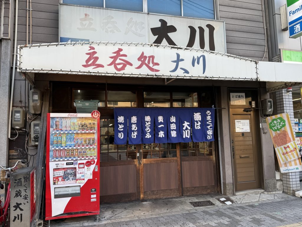 渋い構えと大きな看板が目印。立呑処 大川で軽く一杯いっとくか…超久々に暖簾をくぐるな。大正で数店舗構えるスーパーオオカワや、酒卸をしている株式会社大川が運営するお店。
