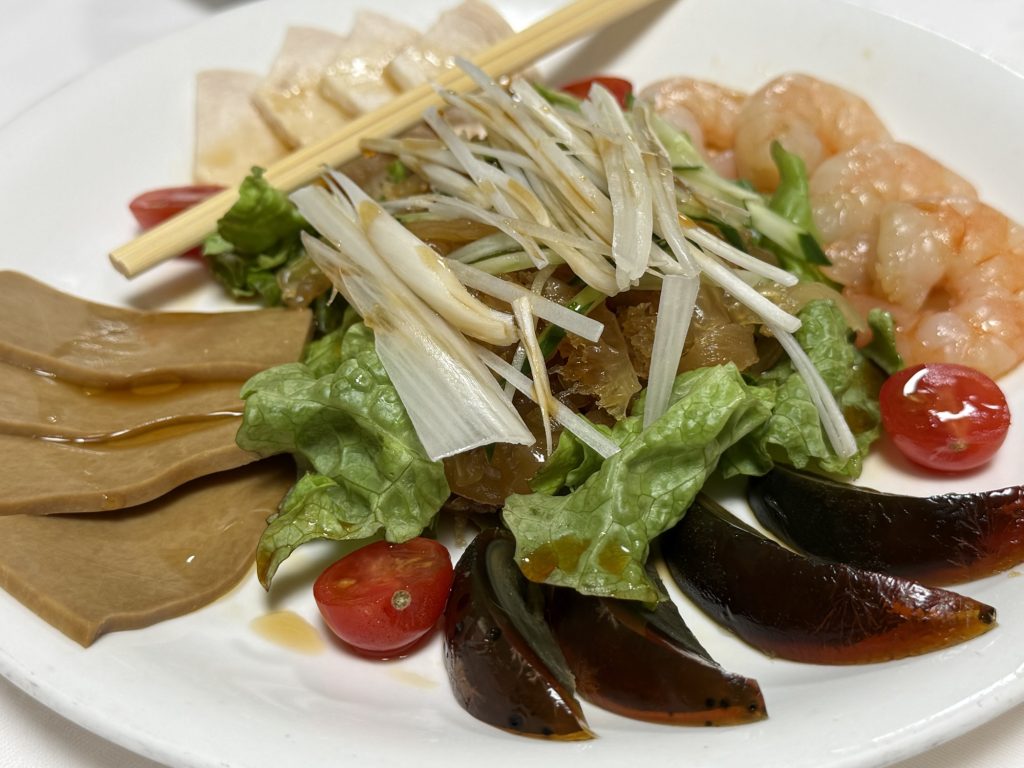 くらげの酢の物、ピータン、蒸し鶏、海老に…このべろーんとした茶色いものはなんでしょうな。