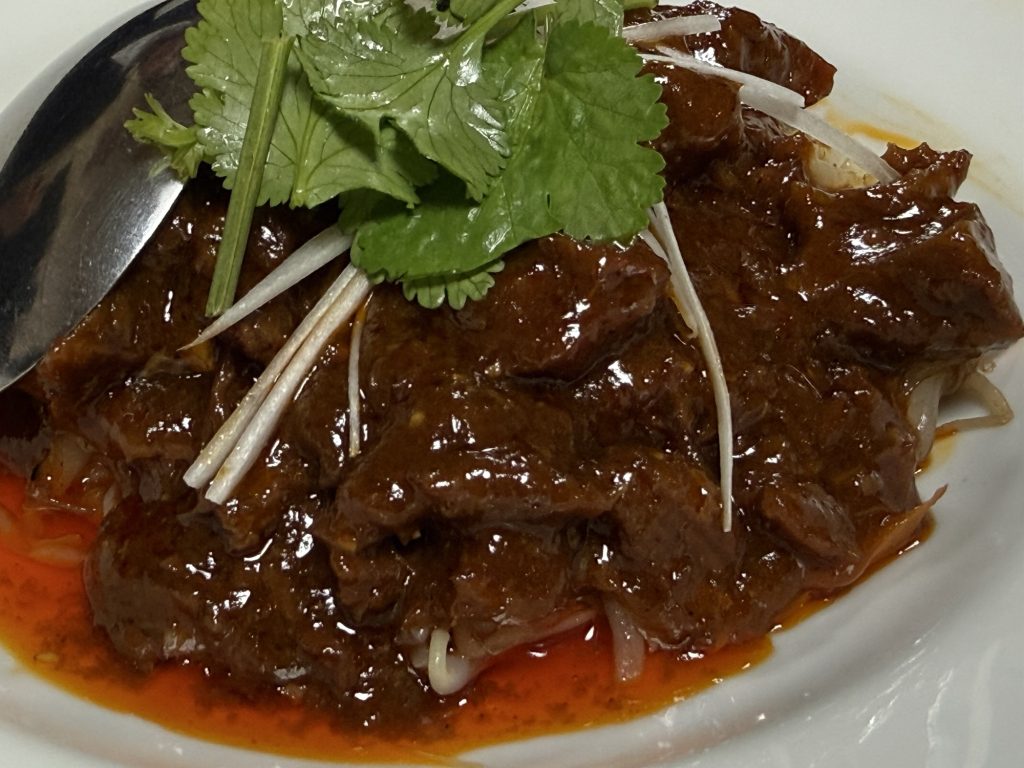 牛肉のほほ肉をじっくり煮込んだもの。見た目醤油ベースの甘辛濃厚ダレかと思っていたんだけど、これは見た目に反して結構刺激的なヒリリをお見舞いされる。豆板醤や唐辛子を筆頭に、山椒や八角等のスパイスで香りも豊か。肉めちゃ柔らかいし、この辛さがたまらんて。