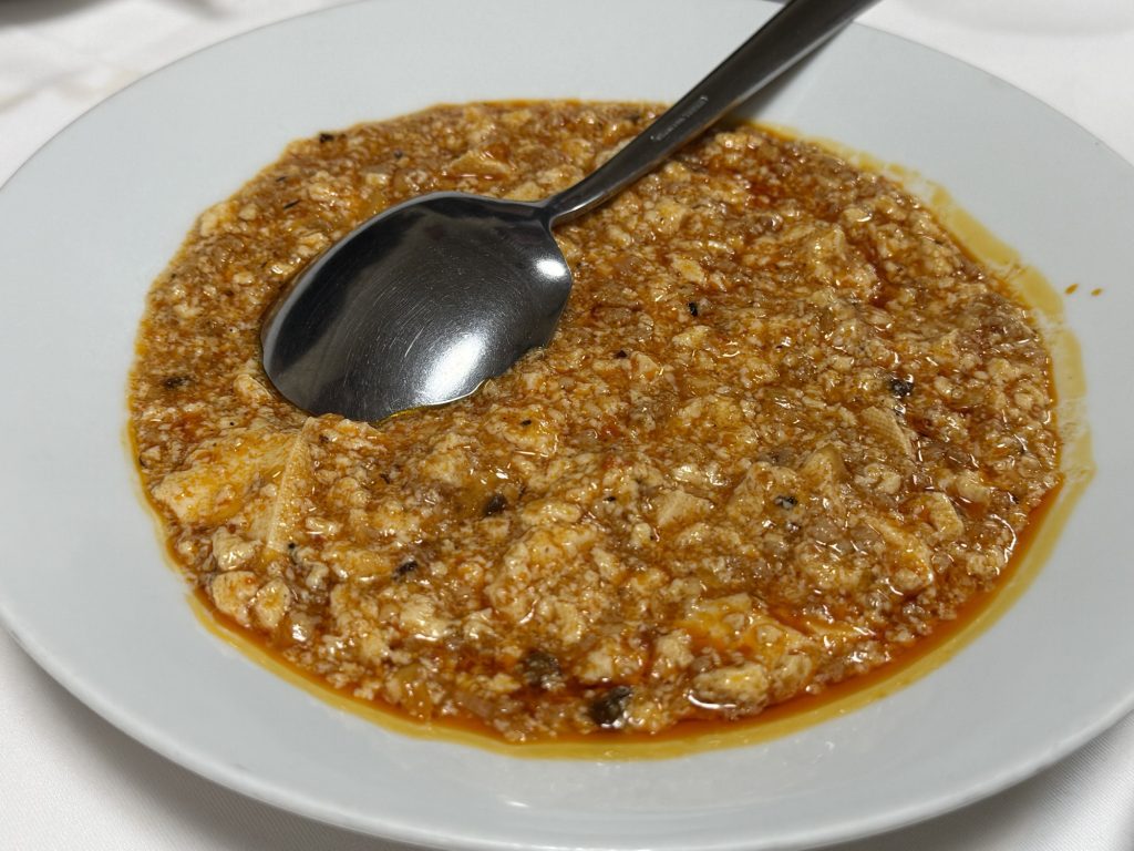 豆腐は潰した形で出てくるのが特徴的。これがまた、豆板醤や豆鼓の辛味やコク、にんにくのパンチと八角等のスパイスが絶妙。シビカラでめちゃうまなんだけど、紅焼牛肉に負けじとヒーヒーをお見舞いされるぞ。