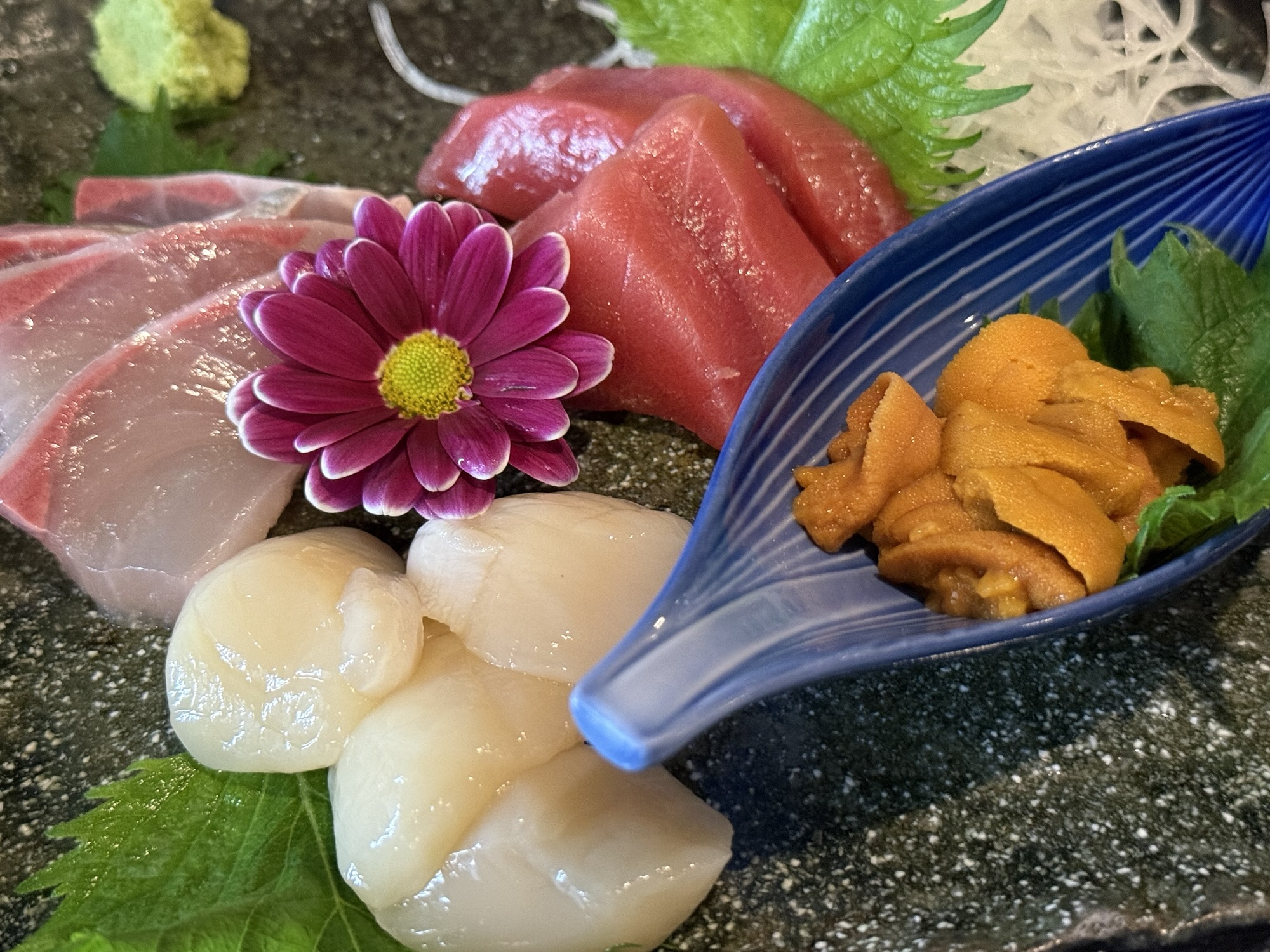 お造りが色々あって良さげですなぁ。盛り合わせが出来るということでお願いすることに。鹿児島のカンパチ、宮城の本マグロ、北海道の生ウニとホタテ貝柱という、見るだけですでに美味しいラインナップ。