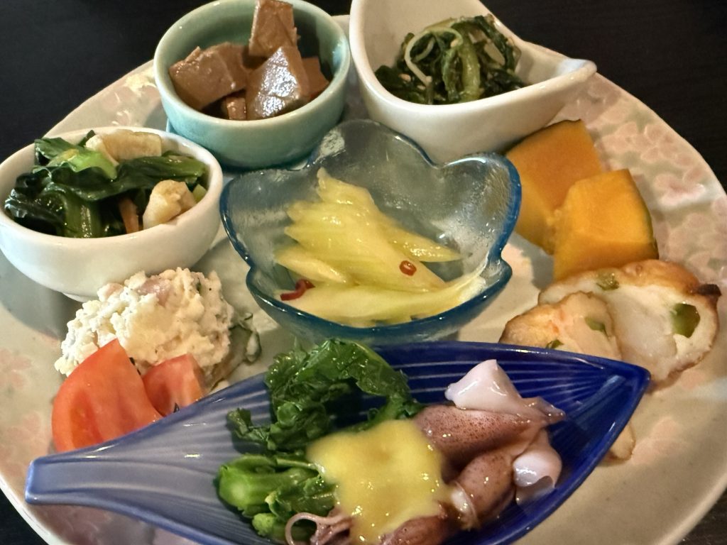 これもいいね〜マグロの角煮、ホタルイカの酢味噌和え、かぼちゃ煮付け、手作りさつま揚げ、ポテトサラダ、セロリの浅漬け、菊菜のごま和え、小松菜煮浸し。