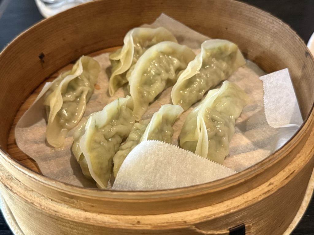 当店名物の手作り餃子か。蒸しでいただきましょうか(7個400円税込)。