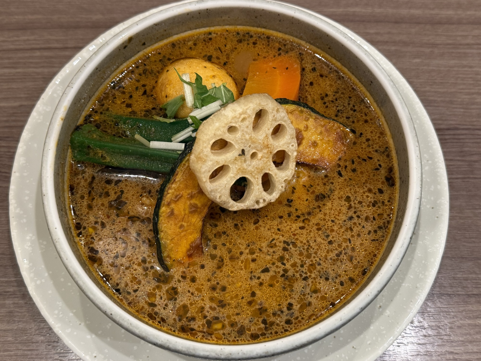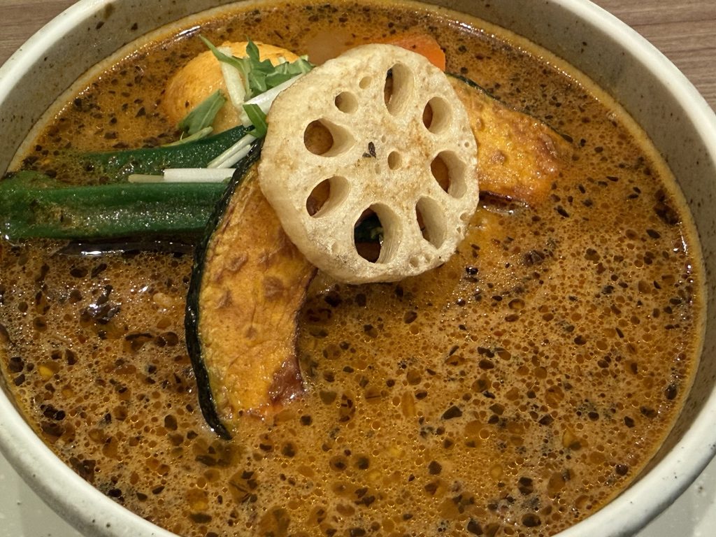 蓮根、かぼちゃ…これは、じゃがいもかと思ったら揚げた玉子か…に、人参、おくらに軽く水菜を散らして。スパイスの香りがとてもいい中、辛さはあまりなく、コクはあるけどさらっと優しい味わい。