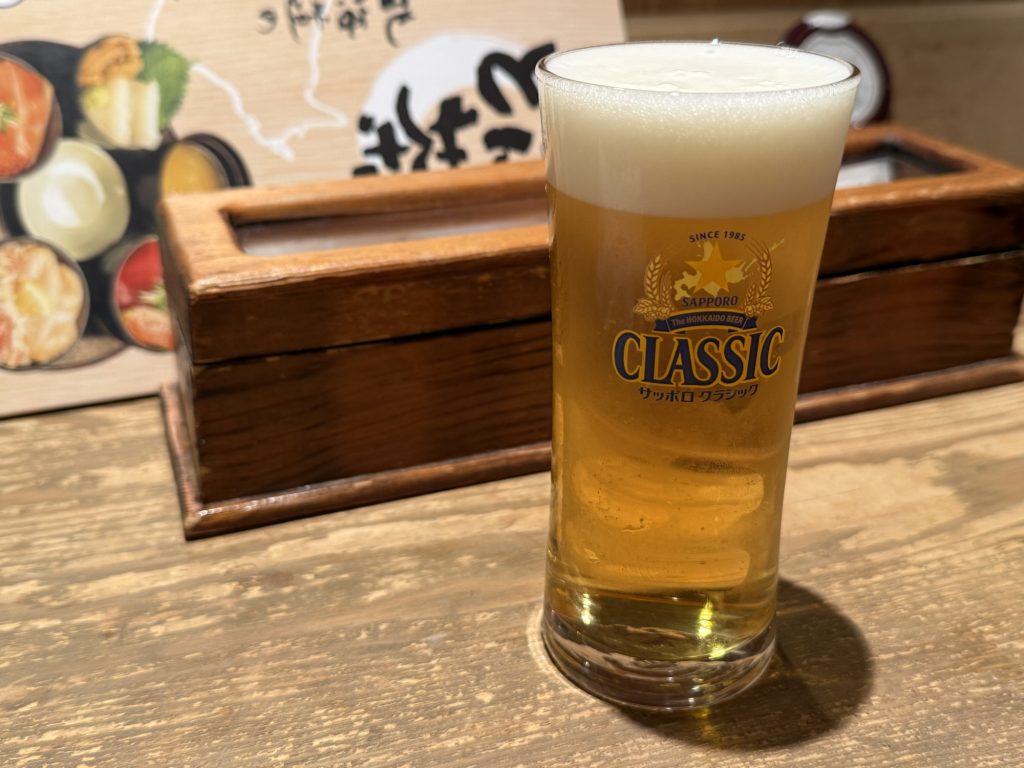 まず、生ビール(小グラス360円税込)はサッポロクラシックをいただきましょうか。