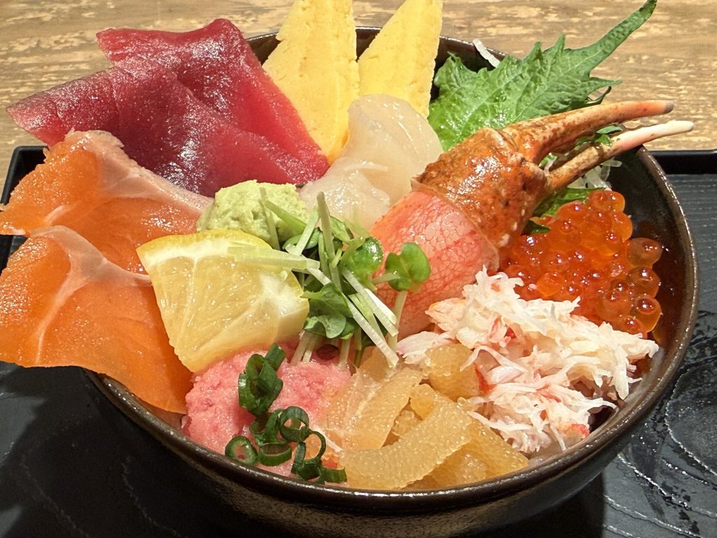 酢飯の上に、マグロ、玉子、サーモン、ネギトロ、帆立貝柱、蟹身と爪、数の子、いくら…9種類かな…のネタが彩りよく盛り付けられている。