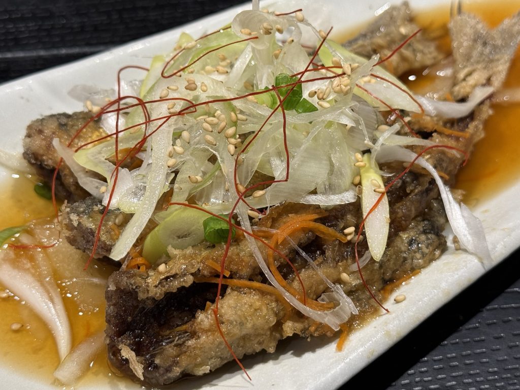 南蛮漬けをメインに据える定食ってあまり見かけたことないんだけど、これみて納得。鰯丸々3尾が南蛮漬けになって出て来ましたよ。酢漬けというよりは、揚げたての鰯をいただく感じ。食べ応えあるし、香ばしくてこれ美味いな。