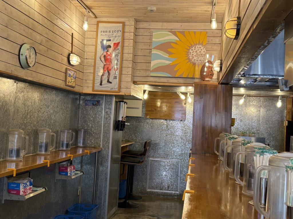 店内も明るい雰囲気で入りやすい立ち食いスタイル。お店の入口にある券売機で食券を買って奥へと進む。