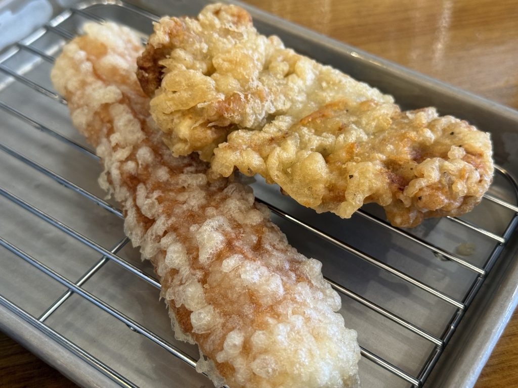 鶏天はニンニク醬油仕立て、揚げたてで軽快なサクサク食感がウメー。ちくわもほんのり甘く、もちっと食感でうまし。