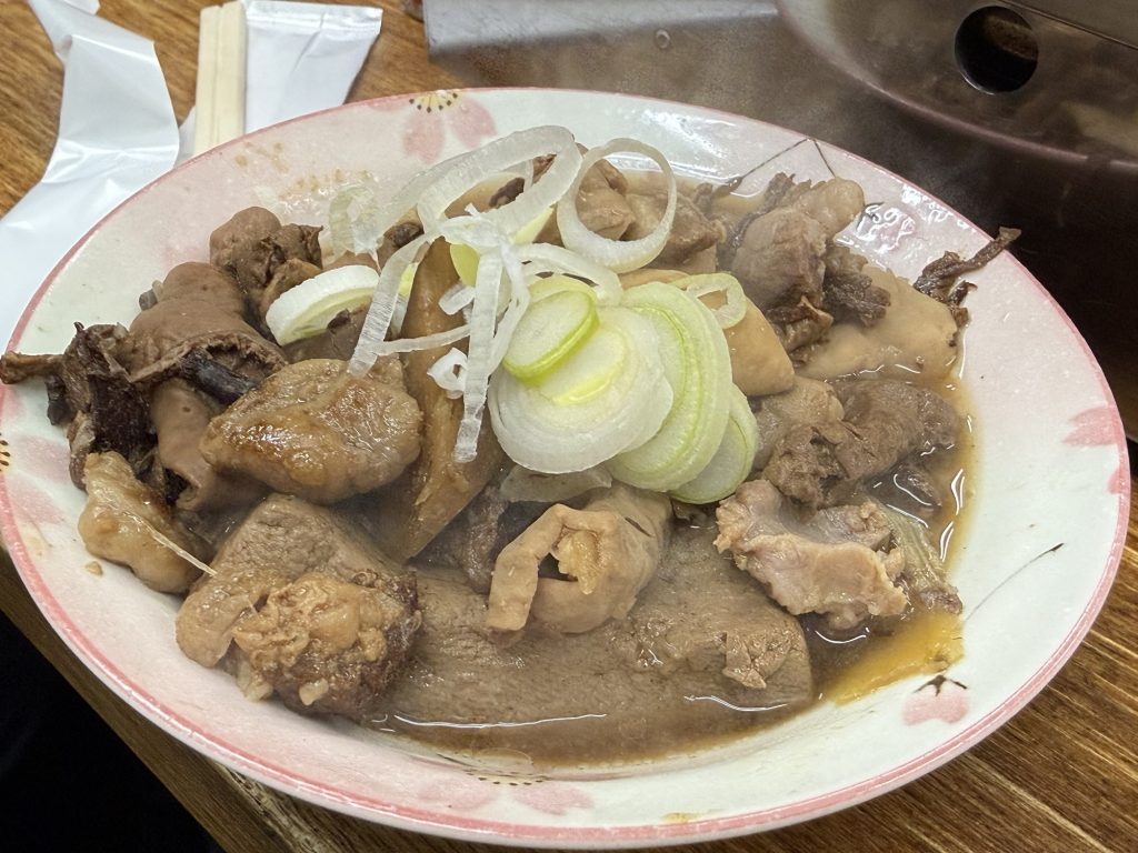 醤油ベースの甘みを抑えたしっかり旨みのある味わいで美味し。染み染み豆腐の上に、もつたっぷりで食べ応えがある。