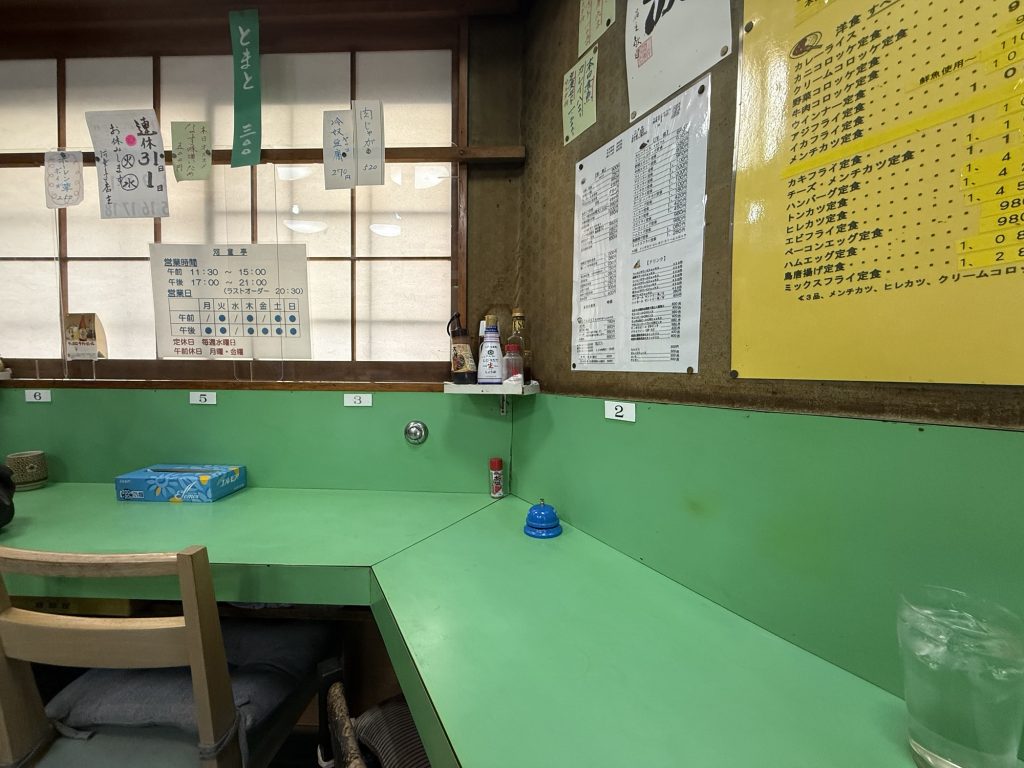 店内はカウンター6席と、小上がりの座敷4人卓が6つ。外観を見た時は感じなかったけど、渋い…店内は渋い。このグリーンなカウンターテーブルがまたいい。