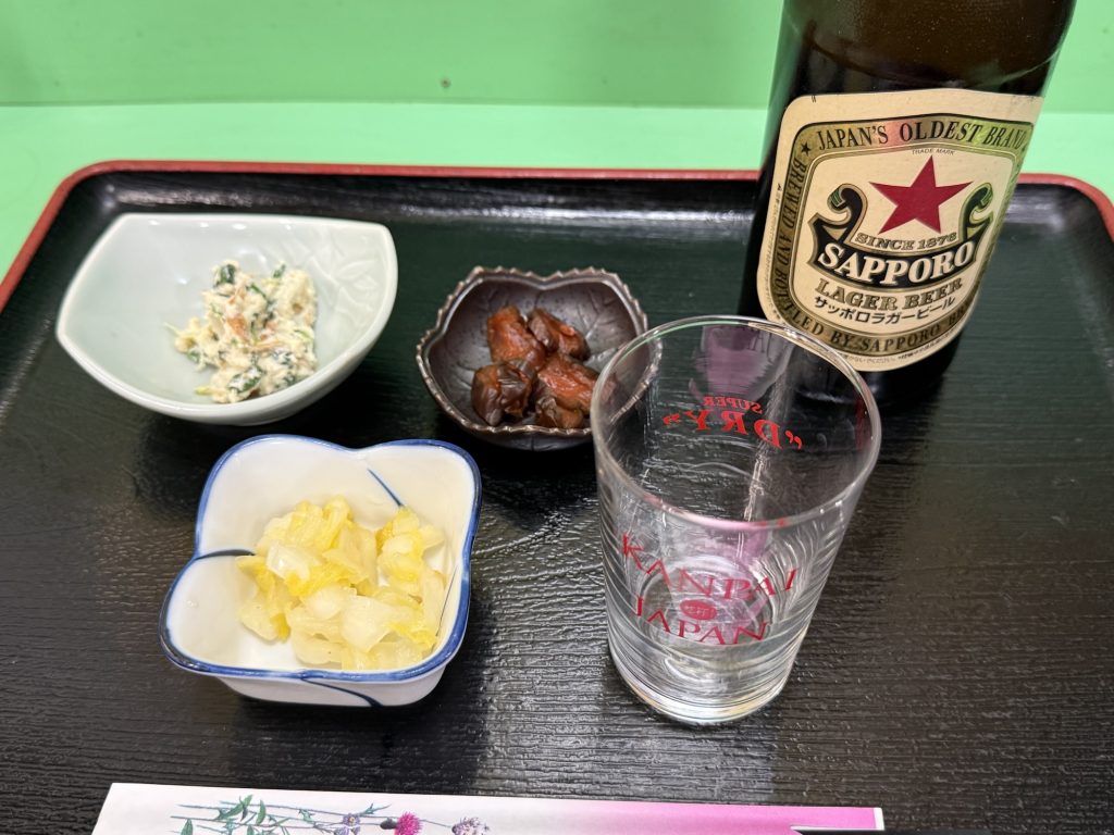 キリンビール 中ビン(680円税込)をお願いすると、お盆でやって来ましたよ。頼んだ定食につく香の物や小鉢なのかしら…香の物が2品あるので、1つがビールについているのかな。